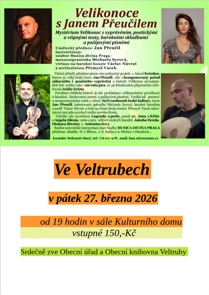 Obecní úřad a Obecní knihovna Veltruby srdečně zve v pátek 27.3. od 16 hodin na Velikonoce s Janem Přeučilem do Kulturního domu ve Veltrubech.